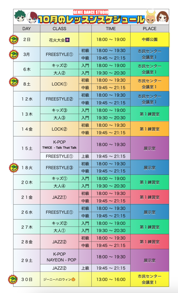 👻絵文字マークがついているところは、イベントまたは通常の曜日と異なっていますので、お気をつけて下さい!